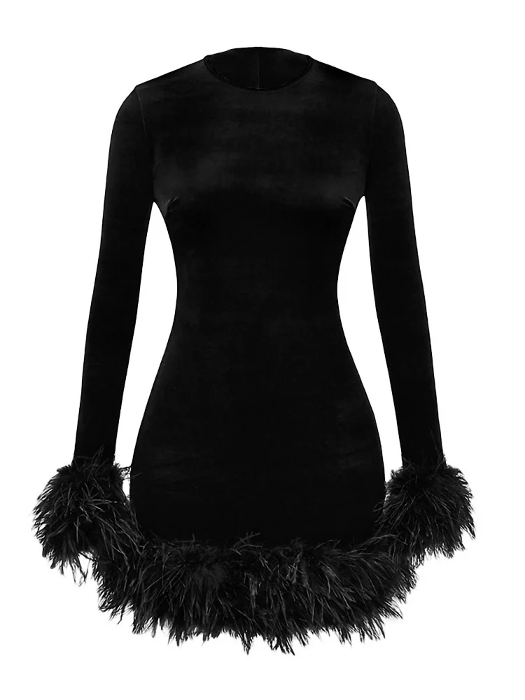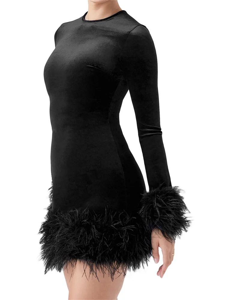 Women Bodycon Dress, Long Sleeve Crew Neck Feather Patchwork Slim Fit Mini Dress for Cocktail Party
