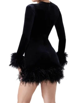 Women Autumn Dress Feather Trim Long Sleeve