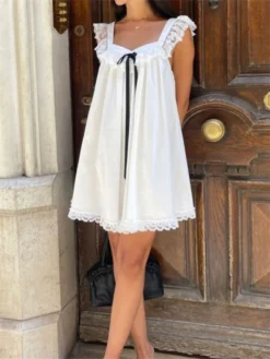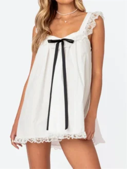 Women Mini Dress Lace Trim Fly Sleeve Bowknot Embellished Short Dress Summer Fashion Casual Dress