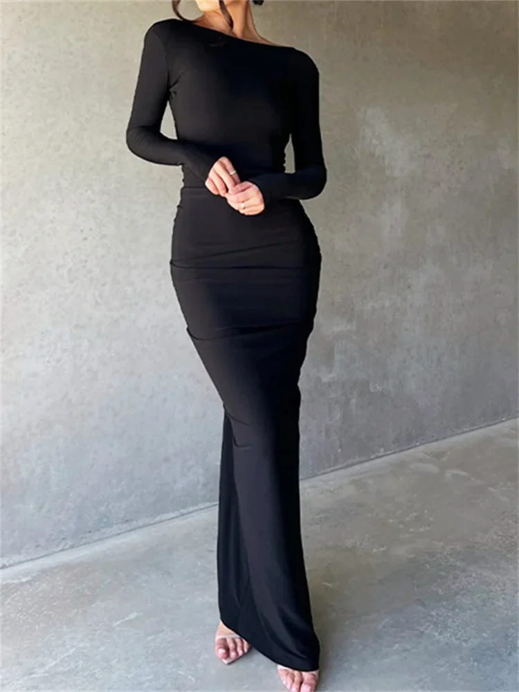 Women Long Bodycon Dress Solid Color Deep V-Neck Ruched Long Sleeve Dress Spring Fall Evening Party Dress